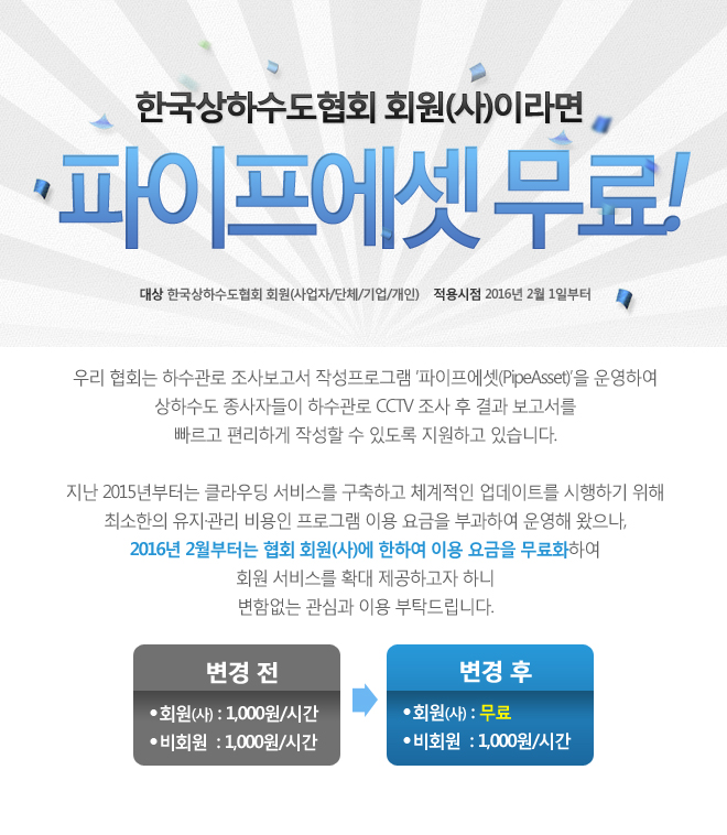 ![]() 한국상하수도 협회회원사에 대한 서비스강화를 위해서 협회회원사에 한해서 파이프에셋의 사용료를 감면합니다. (한국상하수도협회 회원은, 파이프에셋 사용자 회원 가입이 아닌, 별도절차에 의거 한국상하수도협회에 가입된 개인 혹은 기업회원을 의미합니다.) - 협회회원(기업회원사 포함) : 무료 => 기업회원의 경우, 기업당 아이디 1개가 아닌 재직자당 1개의 아이디씩 전면무료 (예: 재직자 3명이 각각 한개씩 총 3개의 아이디를 등록할 경우 해당 아이디 모두 무료사용 단, 재직증명 서류 (4대보험 가입증명서류) 를 협회에 제출해야함. ) * 비회원 : 현행 1,000원/시간(기존과 동일) - 적용시기 : 2016년 2월 1일 이후 - 협회회원 가입 및 연회비와 관련한 문의는 협회 담당자 이효리 사원(02-3156-7762), 가입 후 파이프에셋 무료사용 관련 문의는 김찬영 사원(02-3156-7847)에게 문의바랍니다. ※ 한국상하수도협회 회원 구분 ![]() ※ 기업 및 단체회원 입회비 10만원(등급과 무관하며, 입회 시 연회비와 같이 납부) 개인회원 입회비 1만원(입회 시 연회비와 같이 납부) ※ 한국상하수도협회 회원 가입절차 ![]() |